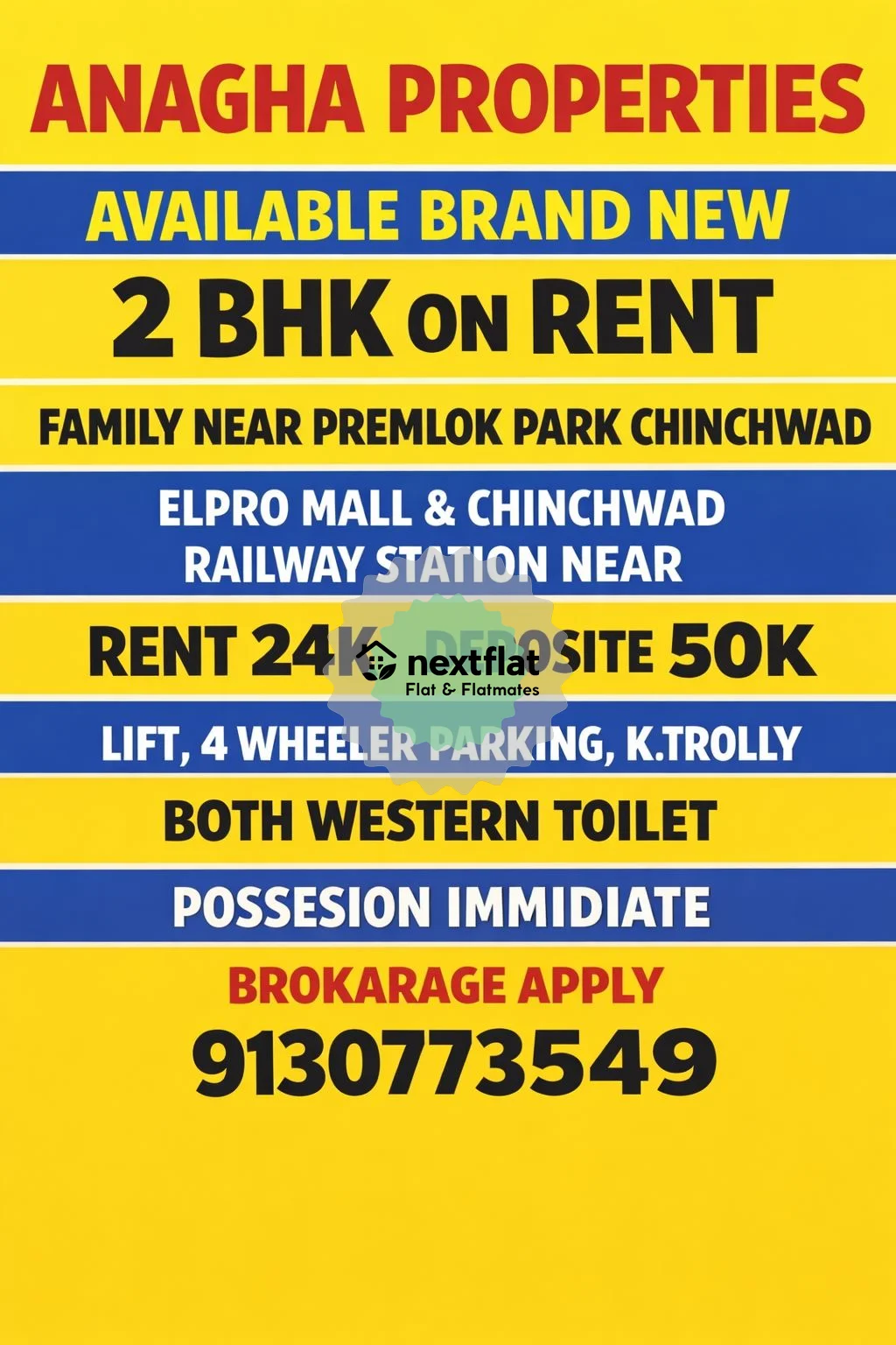 π ANAGHA PROPERTIES π β¨ Brand New 2 BHK on Rent β¨ π Near Premlok Park, Chinchwad π Close to Elpro Mall & Chinchwad Railway Station π¨βπ©βπ§βπ¦ Only for Family π° Rent: βΉ24,000 πΌ Deposit: βΉ50,000 β Lift β 4-Wheeler Parking β Kitchen Trolley β Both Western Toilets β Immediate Possession π Brokerage Apply π² Call / WhatsApp: 9130773549 π Genuine Property | Prime Location | Hurry Up! #AnaghaProperties #2BHKOnRent #BrandNewFlat #ChinchwadProperty #PremlokPark #ElproMall #FamilyFlat #PuneRealEstate #FlatForRent #ImmediatePossession #RentalProperty #PuneHomes
