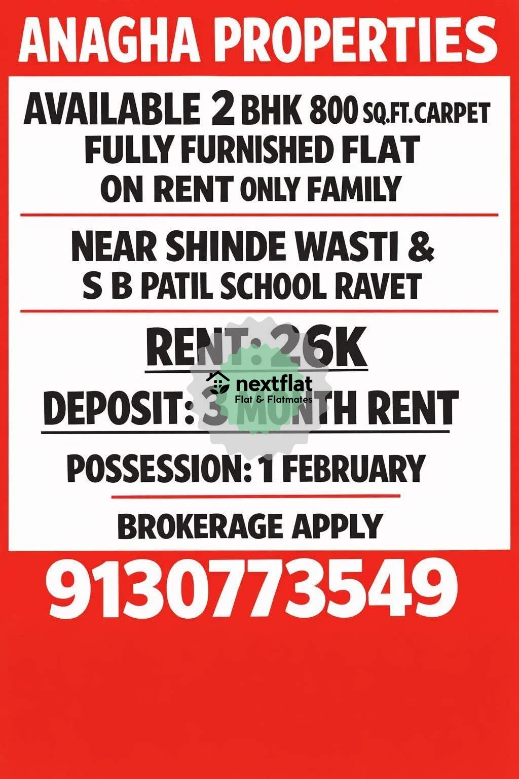 ๐ ANAGHA PROPERTIES ๐ โจ 2 BHK FULLY FURNISHED FLAT ON RENT โจ ๐ 800 Sq.Ft. Carpet Area ๐จโ๐ฉโ๐ง Only for Family ๐ Near Shinde Wasti & S B Patil School, Ravet ๐ฐ Rent: โน26,000 ๐ Deposit: 3 Month Rent ๐ Possession: 1 February ๐ Brokerage Apply ๐ Call Now: 9130773549 #AnaghaProperties #2BHKOnRent #FullyFurnishedFlat #RavetProperty #FamilyFlat #PuneRental #RavetFlatOnRent #ReadyToMove #RentalProperty #PuneRealEstate