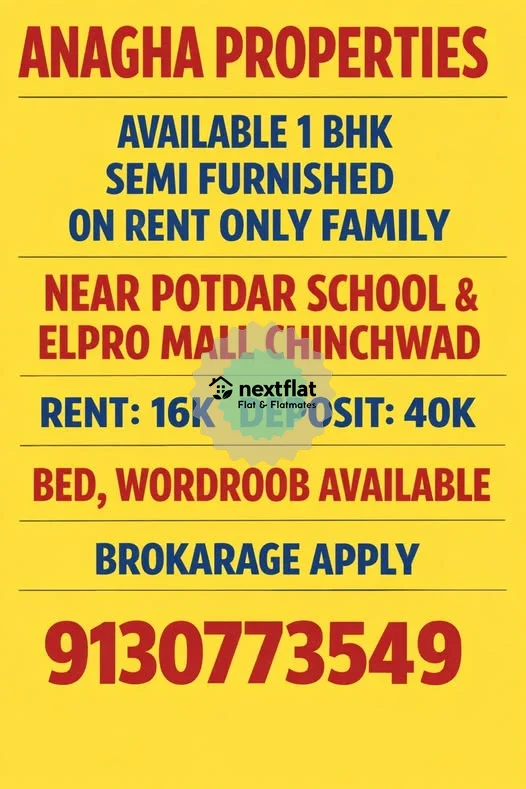 π ANAGHA PROPERTIES β FLAT ON RENT β¨ Available 1 BHK Semi-Furnished Flat π¨βπ©βπ§ Only for Family π Near Potdar School & Elpro Mall, Chinchwad π° Rent: βΉ16,000 π Deposit: βΉ40,000 π Bed & Wardrobe Available π Brokerage Applicable π Call / WhatsApp: 9130773549 π Immediate enquiry welcome! #AnaghaProperties #1BHKOnRent #ChinchwadRent #FamilyFlatOnly #SemiFurnishedFlat #NearElproMall #NearPotdarSchool #PuneRental #FlatOnRent #propertydealer