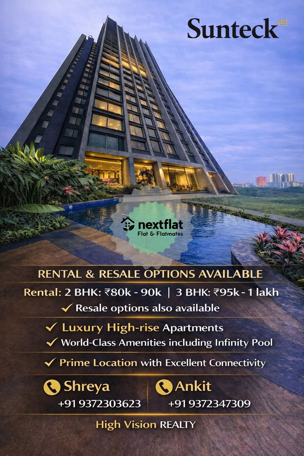 Flatmate requirement Male Flatmate requirement Male Date - Immediately shifting 📍Location:- Sunteck avenue 4 , Goregaon West 🏠 Flat Type: 2 BHk Availability: • 1Master Bedroom ₹42000(single occupancy) 🔒 Deposit: 3 month rent ✅ Modular kitchen ✨ No restrictions 📩 DM for details / visit ——Highvision realty ——- Shreya Pandey ********** Ankit pandey **********