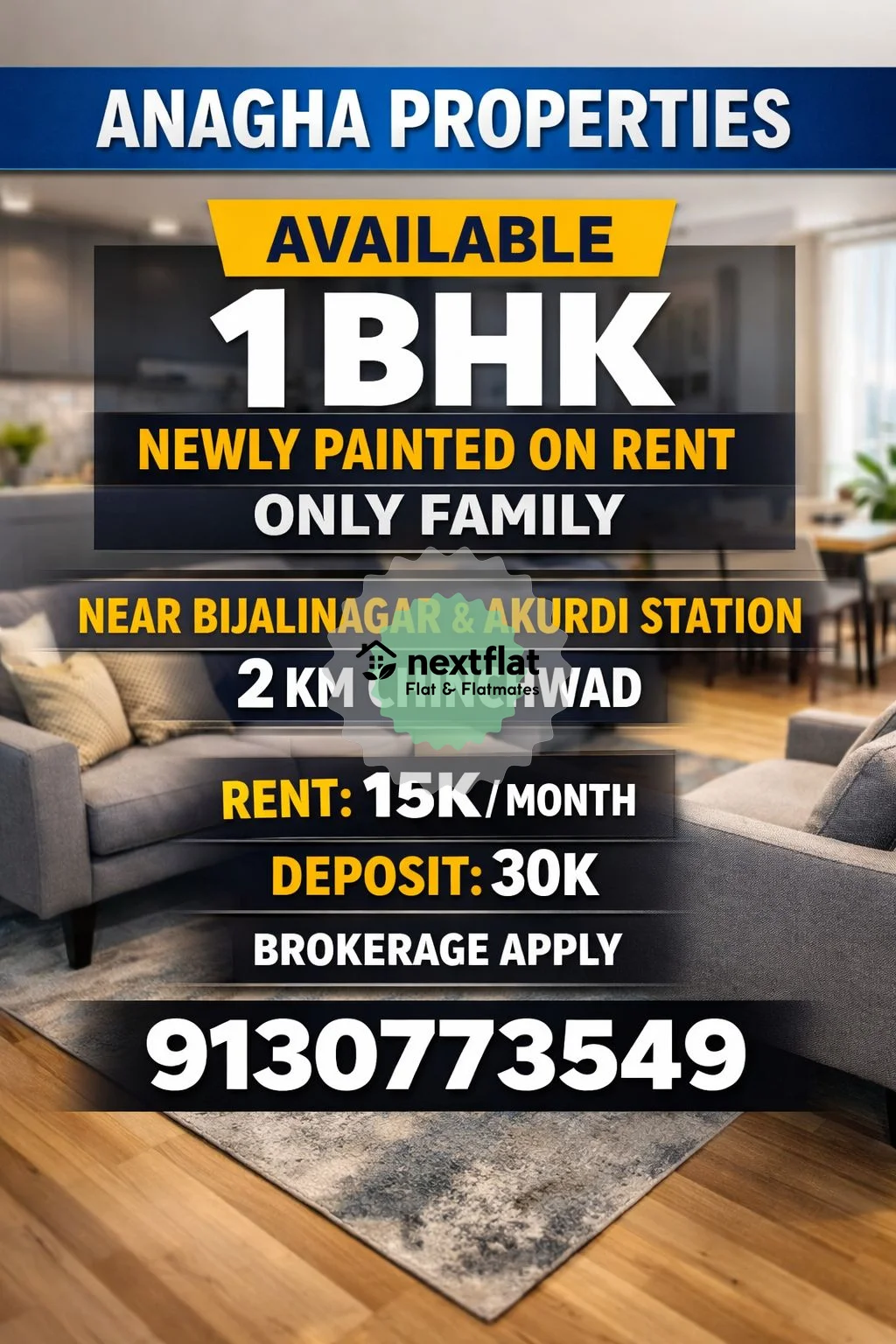 🏡 1 BHK FLAT ON RENT – PRIME LOCATION IN CHINCHWAD! Looking for a clean & newly painted 1 BHK home for your family? This perfect rental is available near Bijalinagar & Akurdi Station (just 2 KM from Chinchwad) – ideal location with easy connectivity! ✨ Property Details: 🔹 1 BHK – Newly Painted 🔹 Only for Family 📍 Near Bijalinagar & Akurdi Station – 2 KM Chinchwad 💰 Rent: ₹15,000 / Month 💰 Deposit: ₹30,000 📌 Brokerage Apply 📞 Contact Now: ********** 🏢 ANAGHA PROPERTIES ⚡ Affordable rent + Prime location – Don’t miss this deal! #ChinchwadRent #1BHKOnRent #PuneRentals #ChinchwadProperty #AkurdiStation #Bijalinagar #PuneProperty #RentalProperty #FlatOnRent #PuneRealEstate #AnaghaProperties #FamilyFlat #PuneHomes #PuneFlatRent #propertyinpune
