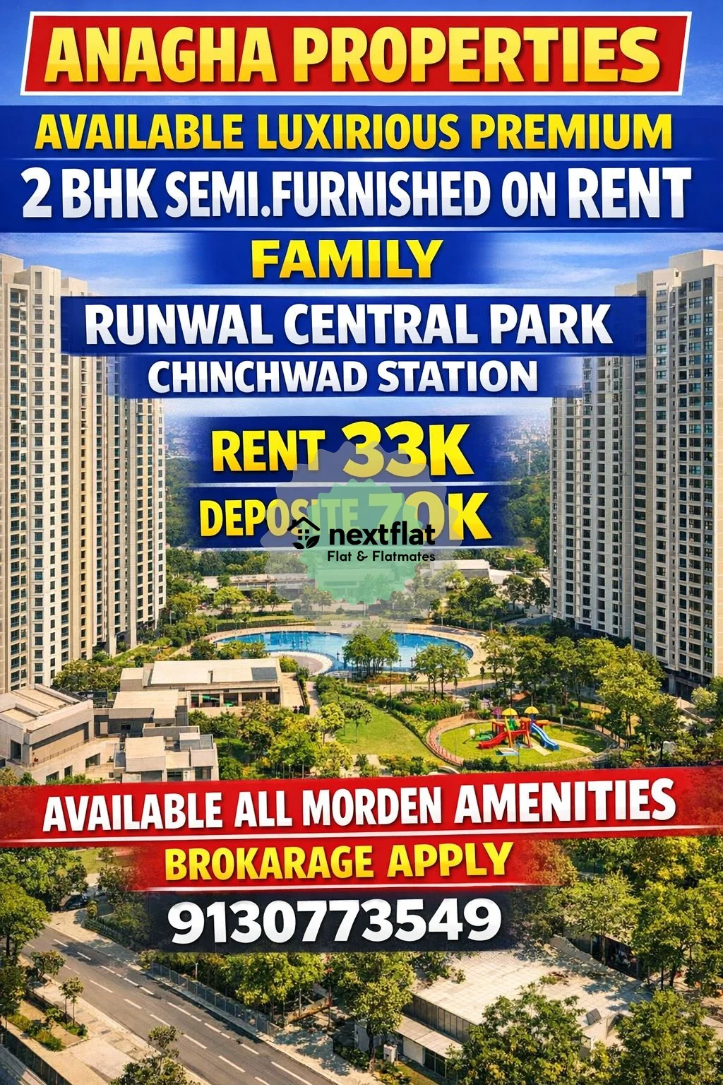 ๐จ HOT PROPERTY ALERT โ CHINCHWADโS MOST DEMANDED LOCATION! ๐จ ๐ก ANAGHA PROPERTIES PRESENTS โจ Luxurious Premium 2 BHK Semi-Furnished Flat for Rent ๐ Runwal Central Park, Near Chinchwad Station ๐จโ๐ฉโ๐งโ๐ฆ Perfect for Family | Safe Gated Society ๐ฐ Rent: โน33,000 Only ๐ต Deposit: โน70,000 ๐ Enjoy Premium Lifestyle Amenities: ๐ Swimming Pool | ๐๏ธ Gym | ๐ณ Garden ๐ข Clubhouse | ๐ Parking | ๐ 24x7 Security & CCTV ๐ฅ Live Where Comfort Meets Luxury! ๐ฅ Prime Location + Premium Society + Best Price! ๐ Call Now: ********** ๐ผ Brokerage Applicable โก HURRY! Properties in this area get rented FAST! ๐ Book your visit today before itโs gone! ๐ฅ #AnaghaProperties #RunwalCentralPark #Chinchwad #PuneRealEstate #2BHKonRent #LuxuryFlat #FlatForRentPune #DreamHome #GatedSocietyLiving #ModernLifestyle #FamilyFlat #PuneHomes #RentInPune #PropertyDealer #HouseHunting #RealEstateLife #ViralPost #TrendingNow #BestDeal #BookNow ๐