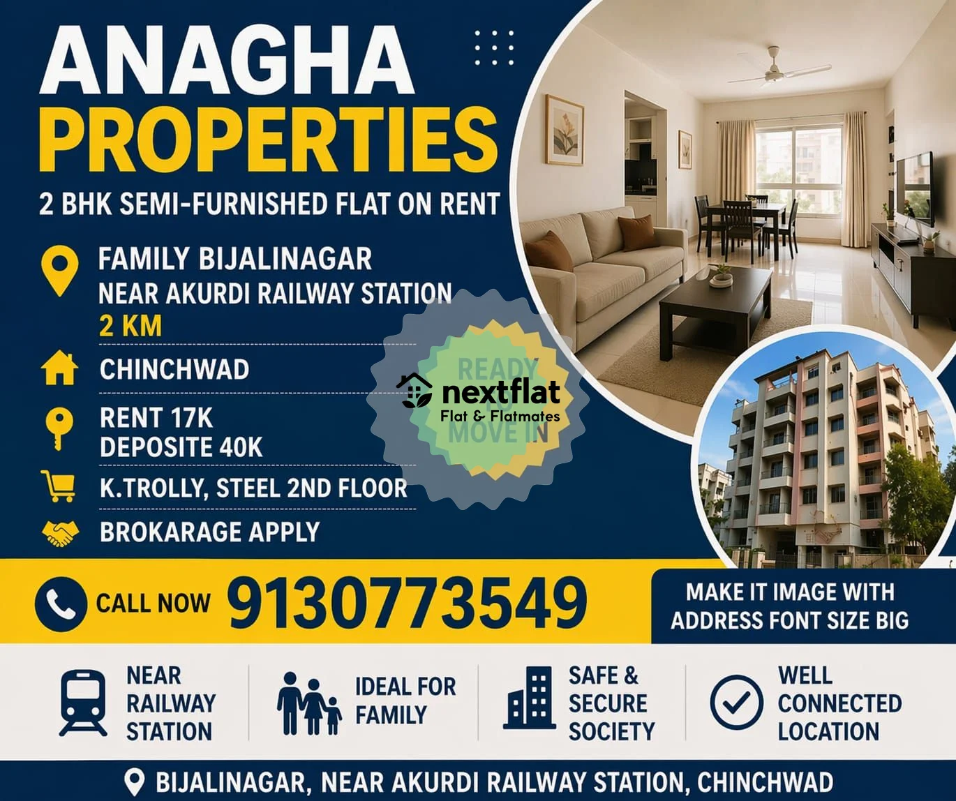 🔥 2 BHK @ JUST ₹17K Near Akurdi Station? YES, IT’S REAL! 🔥 🏡 ✨ Perfect Family Flat in Prime Location – Ready to Move! ✨ ANAGHA PROPERTIES brings you a Spacious 2 BHK Semi-Furnished Flat in 📍 Bijalinagar (Near Akurdi Railway Station | Just 2 KM from Chinchwad) 💯 Best option for family living with connectivity + affordability! 💰 Rent: ₹17,000 💵 Deposit: ₹40,000 🛠️ Flat Features: ✔️ Kitchen Trolley ✔️ Steel Storage ✔️ 2nd Floor Flat ✔️ Family Preferred 🚆 Close to Railway Station – Daily travel made easy! 📞 Call Now: ********** ⏳ Hurry! Flats in this budget & location get booked FAST! 🔥 👉 Don’t Wait… Your Perfect Home Won’t Stay Available! 🚀 #FlatForRentPune #AkurdiHomes #ChinchwadLiving #2BHKRent #PuneRental #AffordableFlat #Bijalinagar #FamilyFlat #RealEstatePune #HouseForRent #HotProperty #DreamHomeAlert #BudgetHomes #RentalDeals #PuneHomes #QuickDeal #AnaghaProperties #ViralAd #MustSee #booknow
